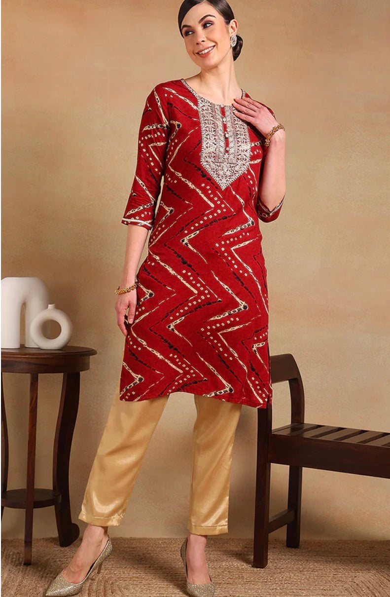 Elevate your everyday style with this stunning red viscose rayon straight kurta, designed with a bold chevron printthat stands out effortlessly. Lightweight, breathable, and beautifully flowy, this piece brings together comfort and festive charm in one easy-to-wear silhouette.