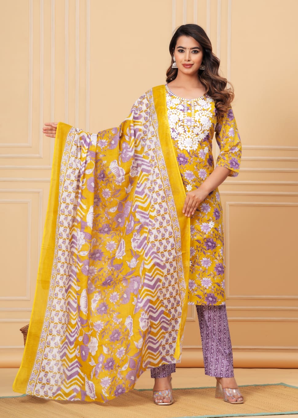 Brighten up your ethnic wardrobe with this yellow and purple 3-piece kurta set, featuring delicate Chikankari embroidery for a timeless, handcrafted charm. Made from soft, breathable pure cotton, this ready-made suit includes a matching pant and dupatta, offering both comfort and style. Perfect for festive occasions, casual gatherings, or daytime events.